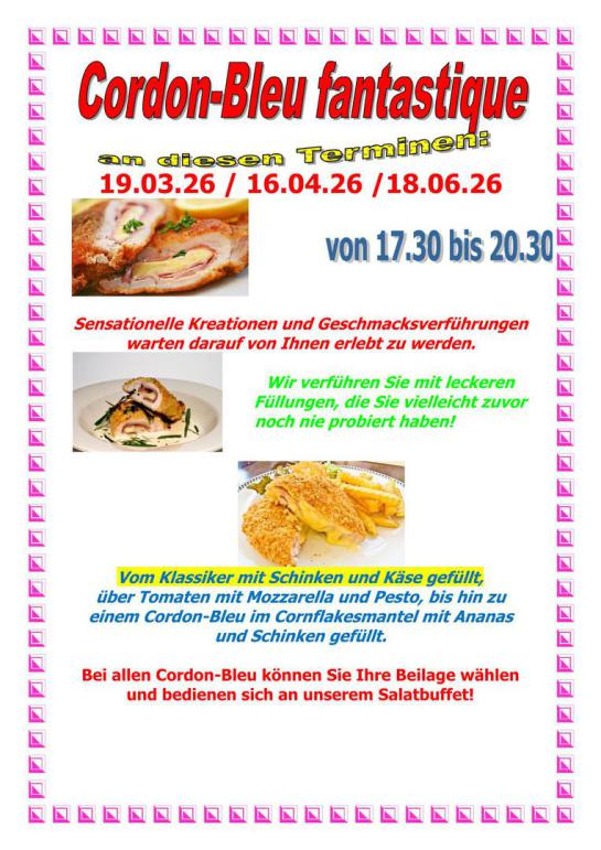 Unsere Cordon bleu werden frisch gefüllt und goldbraun gebacken und mit Ihrer Wunschbeilage serviert.